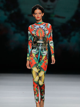 Con Skully Tulum, Maya Hansen viaja al Caribe mexicano para reinterpretar la iconografía del Día de los Muertos a través de la corsetería contemporánea. La colección fusiona anatomía y espiritualidad, hueso y coral, en un diálogo entre la vida y la muerte. Los corsés, confeccionados en rasos estampados y polipieles, se combinan con capas ligeras, monos elásticos y vestidos de estructura orgánica, donde la espina dorsal, el esternón y las costillas inspiran cortes y relieves. Hansen incorpora materiales poco habituales en moda —latón fresado, metales troquelados y metacrilatos— que evocan piezas rituales y amuletos protectores. Los accesorios, diseñados junto a Patricia Nicolás, replican formas óseas cortadas con láser sobre metacrilato, mientras el calzado creado por FOSCO refuerza el contraste entre la sensualidad y la fuerza. Skully Tulum transforma la herencia cultural mexicana en una ofrenda contemporánea: una explosión de color, simbología y técnica que eleva el corsé a objeto sagrado.